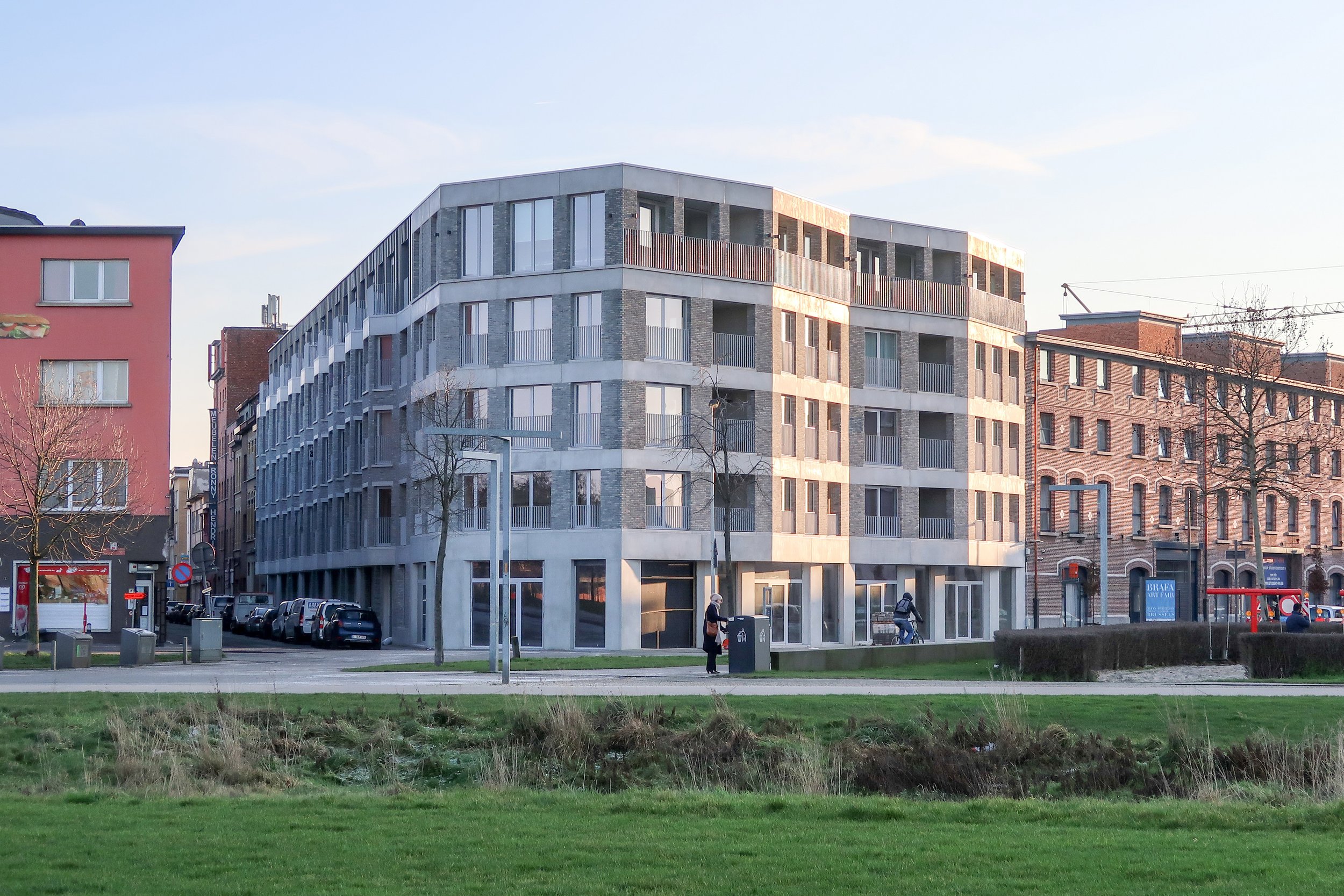 De materialiteit is eenvoudig, mat, monochroom en stedelijk. Het ontwerp voorziet in een plint in grijs beton, lijf en kroon in lichtgrijs gesmoorde baksteen. De vierde verdieping wordt in de Dambruggestraat opgevat als een daklaag en ook als dusdanig gematerialiseerd. De kroonlijst sluit aan bij de karakteristieke kroonlijst in de straat. Ook in de Lange Dijkstraat wordt de kroonlijst aangehouden van de naastliggende Sint-Jozefmagazijnen (inventaris erfgoed).
